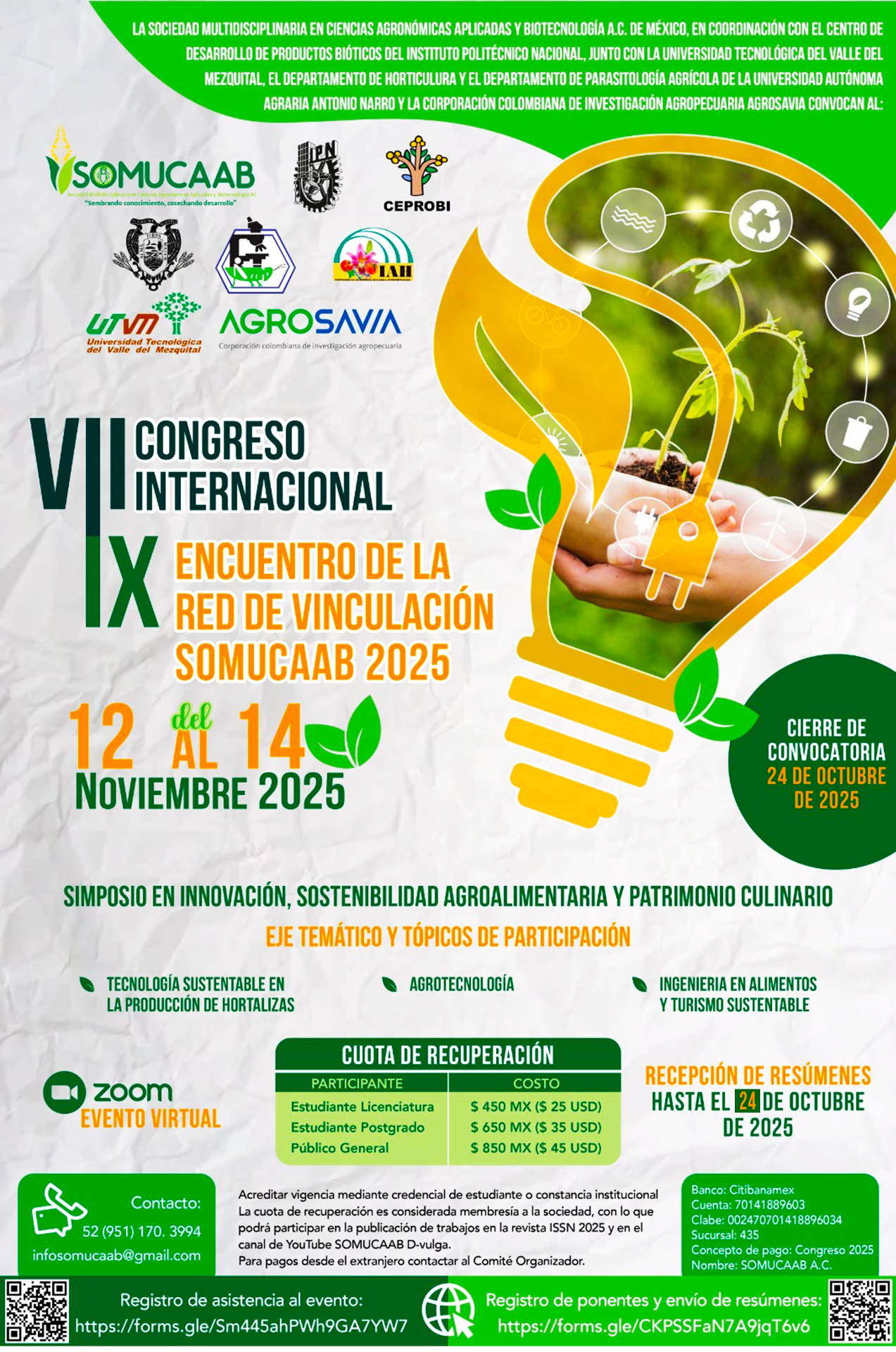 LA SOCIEDAD MULTIDISCIPLINARIA EN CIENCIAS AGRONÓMICAS APLICADAS Y BIOTECNOLOGÍA A.C. de México, en coordinación con el Centro de Desarrollo de Productos Bióticos del Instituto Politécnico Nacional, junto con la Universidad Tecnológica del Valle del Mezquital, el Departamento de Horticultura y el Departamento de Parasitología Agrícola de la Universidad Autónoma Agraria Antonio Narro y la Corporación Colombiana de Investigación Agropecuaria AGROSAVIA